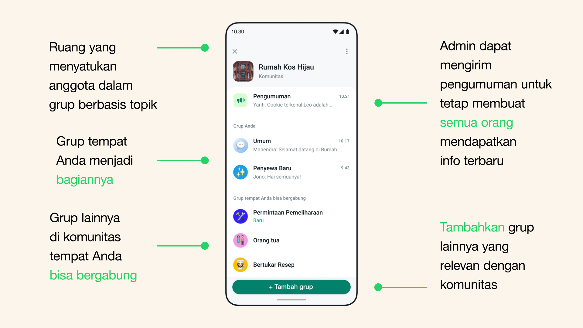 Admin komunitas dapat mengabarkan info penting kepada para anggota dengan mengirim pengumuman. Anggota komunitas dapat tetap terhubung dengan menjelajahi dan chat di grup yang mereka minati.